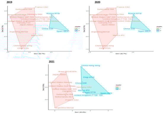Stock index clusters by K-means (2019, 2020 and 2021). Author’s own elaboration with data from Yahoo Finance and R-4.3.1 software.