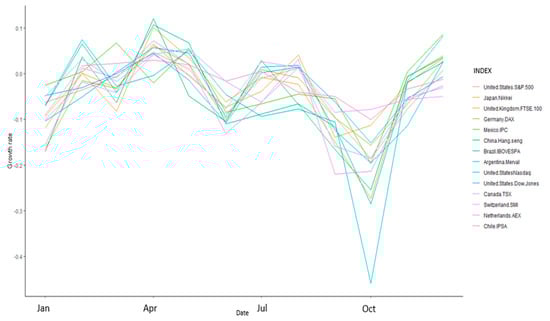 In order to make the analysis more robust among the stock indices for both crisis periods, the behavior of the stock indices returns in the first group for 2008 is presented in Figure 7. For October 2008, there were significant falls in all indices, with the Merval of Argentina and the IBOVESPA of Brazil suffering the largest decreases with −46% and −28%, respectively.