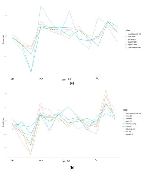 For the case of 2020, Figure 8 shows that the behavior pattern among the indices for the first group is similar to the last one, being the Merval and IBOVESPA of Argentina and Brazil, who presented the most considerable decreases for March of that year, with falls of −36% for both. In addition, the Argentine index shows the largest fluctuations compared with the others. For the second group, the behavior between the indices intensifies for March and November, respectively, highlighting the fact that the Spanish IBEX and the Russian RTSI present the largest decrease for March, but they also show the greatest recovery by the end of 2020.