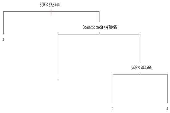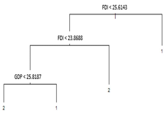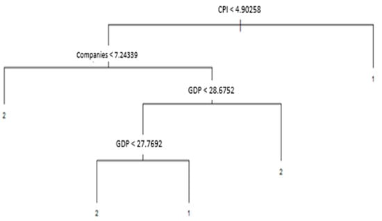 Once the clusters are determined, the Classification Trees (CT) tool is applied. The objective is to determine the rules or characteristics, as well as their reference values, that led the countries of the same group to behave in this way during periods of crises. According to Gámez-Martínez et al. [45], p. 34, the classification tree methodology can work with continuous variables and categorical variables. The construction of the tree is done during the learning phase, which can be simplified into the following steps that are applied iteratively: