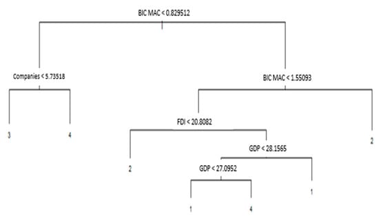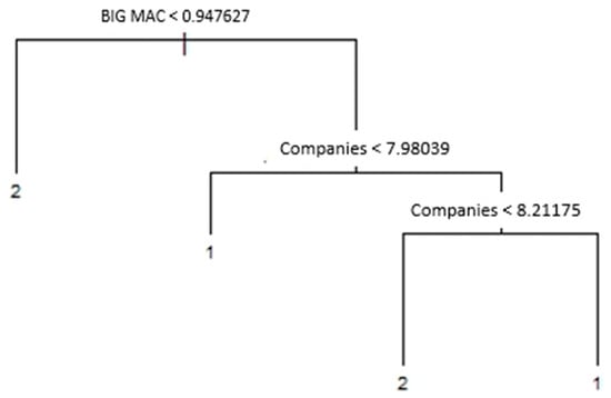 For the year 2008, it can be seen in Table 4 that the number of conditions for groups 1 and 2 are two for both. For this year, the variables that determine both groups are the BIG MAC Index (BIG MAC) and the companies that are listed on the stock exchange as shown in Figure 10.