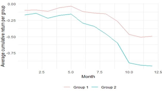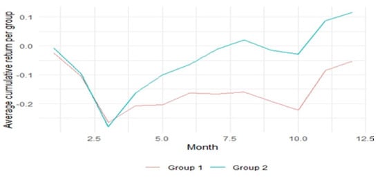 The first case analyzed is the 2008 crisis. As can be appreciated, there are two groups where the performances of the average cumulative returns of the stock market indices belonging to each cluster are presented in Figure 14. The cumulative trend of negative returns can be seen for both groups; however, group 2 has the worst performance with a negative average cumulative return of approximately 75%.