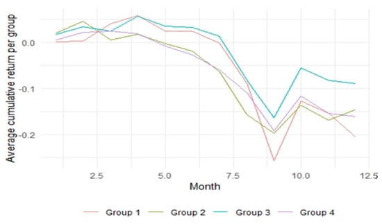 In what follows, the same analysis is carried out as before for the periods of 2011 and 2020. For the first case, four groups can be seen (Figure 15), where the average accumulated returns of the members of each cluster are very similar to each other. With respect to the pattern of contagion, despite the negative trend of average accumulated returns for all groups, it is cluster 3 that presents a better performance.