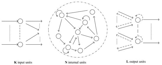 An ESN is a new type of RNN with the above structural description. In Figure 1, K, N and L are the number of neurons in the input, hidden and output layers, respectively. Large-scale RNNs are used as a dynamic library in the hidden layer, which can also be abbreviated as dynamic reservoir (DR). These leaky-integrator neurons that make up these DRs are triggered by appropriate input and output feedback. When compared to come forward NNs such as an RBFNN, an ESN has the advantage of faster training and does not require changing the connection weights between inputs and energy storage in the hidden layer. The continuous-time dynamics of the ESN used are followed by