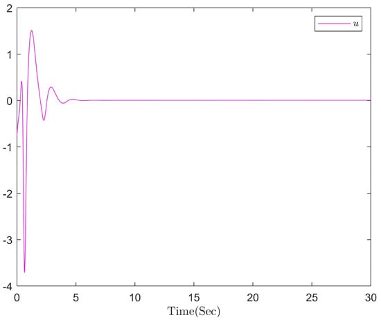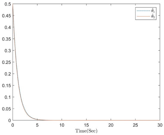 Figure 2, Figure 3, Figure 4 and Figure 5 show the simulation results. Figure 2 shows the correlation curves between the state variable and its corresponding estimate. The reaction of the actual controller u is shown in Figure 3. The paths of the adaptive laws , , and are depicted in Figure 4 and Figure 5, respectively. According to the different points of the results of this paper and others, such as in the design of the controller while considering the observer, time-delay and unknown control gain brought under the influence of the designed controller and adaptive law is more stable. These figures demonstrate that the simulation results support the effectiveness of the suggested control strategy.