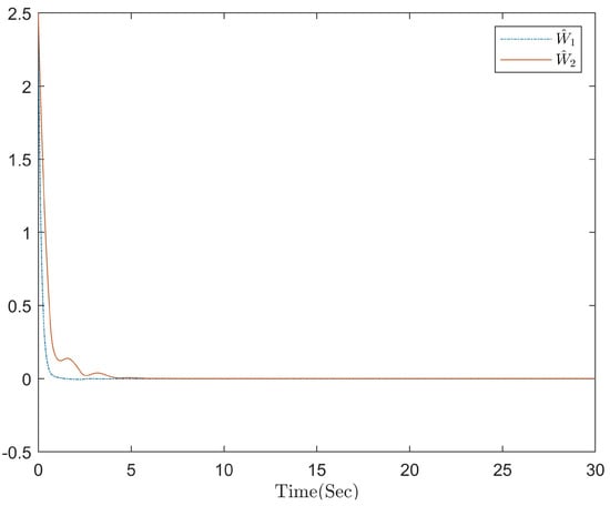 where and are the constant parameters, and is a constant in with . Since the ideal weight matrix W is typically unknown in practice, , an estimation of W is used and updated by creating adaptive laws online to ensure the asymptotic tracking performance.
