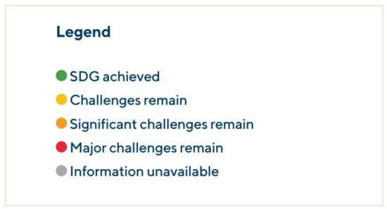 Currently, each variable is divided exactly into subsets defined by quantitative thresholds that map each value of an indicator to a colour code (green, yellow, orange, red, or grey). These colour codes represent how far a country is from meeting a given SDG [54]. The colour legend used is illustrated in Figure 2 and associates a colour with a linguistic description of the progress of a country towards achieving an SDG [56].