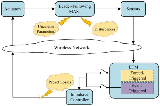 Figure 1 describes the operation of an MAS and its control loop. The system utilizes sensors to collect state information and determine if the triggering conditions have been met. If the conditions are met, the sensor information is transmitted wirelessly to the impulsive controller, which generates a control signal. This signal is then fed back to the system by the actuator, creating a closed-loop control system that stabilizes the system. Moreover, It is noteworthy that in the event triggering mechanism, only one condition will be satisfied between forced-triggered and event-triggered. However, if packet loss occurs during the transmission of the control signal, the signal received by the system may be invalid, causing the system to become unstable. Therefore, it is crucial to ensure the reliability of the wireless network to prevent packet loss and maintain the stability of the system. To summarize, this paragraph highlights the importance of reliable communication in MASs and its significant impact on system stability.