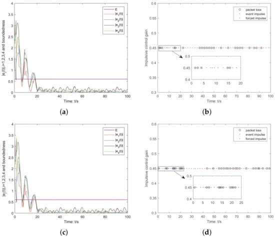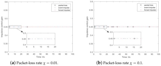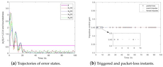 Furthermore, by selecting the parameters and in the ETM (6), it can be shown in Figure 3a,b that the trajectory of the error state variable and the triggered situations of event impulsive instants can be obtained, respectively. To examine the impact of different control packet loss rates on the triggering instants. Let and , the triggering instants in these cases are shown in Figure 4a,b, respectively. Through observation, we can see that as the control packet loss rate increases, the number of triggering instants also increases accordingly, while more forced impulse instants are required when the packet loss rate is low.