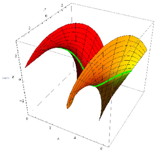 (1) If , , where , and , then Equation (15) is satisfied. Thus, we have a surface with a mutual geodesic curve as (Figure 1):