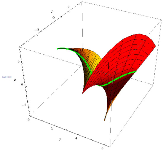Notice that, in this family, there exist two geodesic curves crossing during each point on : one is itself and the other is a straight line in the orientation as in Equation (23). All the elements of the iso-geodesic ruled surfaces is specified by two functions , and , that is, by the orientation vector function . In Example 1 for , the ruled surface is shown in Figure 5. Figure 6 shows the surface with and .