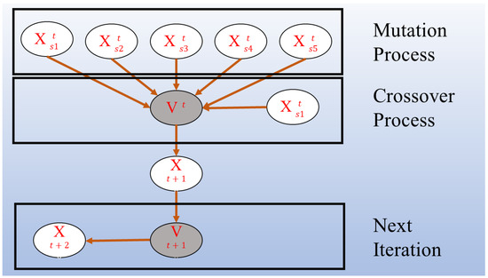 We can easily find the correspondence of these algorithms with Equation (1). Taking DE as an example, we can use to denote , to denote , to denote , and take and to 0. Similarly, the other four algorithms can be represented by Equation (1). Therefore, it can be concluded that these five algorithms differ in the mutation only in the selection of individuals and in the multiplicity of difference amplification. We can rely on this to first analyze the possible network distribution of the algorithm from the perspective of the formula. Since the experimental approach of PIN does not need to consider the difference between + and −, we list the individuals used in each algorithmic mutation and crossover: