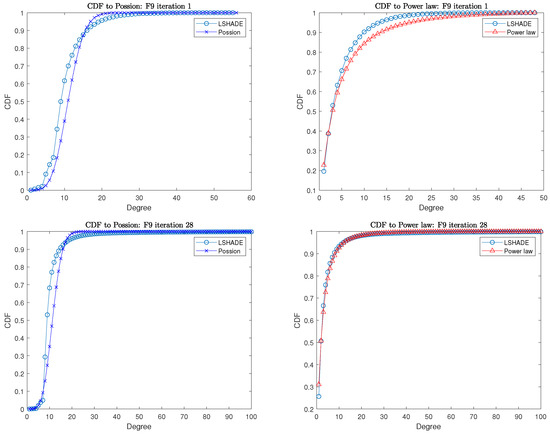 Figure 2 presents the cumulative distribution plot of LSHADE while fitting to two probability distributions at the beginning and end of the iteration. It is evident that the network structure of the algorithm undergoes significant changes during the PIN statistics iteration, as depicted from top to bottom in the figure. The results before and after fitting the Poisson distribution do not change significantly, but there is a large gap before and after fitting the power-law distribution in the figure. To gain a more comprehensive understanding of the algorithm’s dynamic changes, we further analyze its transformations using continuous experimental data. In our analysis of the experimental results, we will examine the correlation between the algorithm’s behavior, which tends to favor exploration or exploitation, and the two distributions. If a consistent pattern emerges, it can serve as a plausible explanation for the relationship between the algorithm’s perceived exploitation and exploration strategies. This interpretation should be based on a dynamic network change and not only on the results of the last recording (e.g., iteration 28 in the figure).