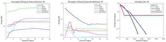 Combining the two probability distributions to analyze the convergence process of the algorithm is difficult, but we can still find some connections. Based on our proposed hypothesis, the Poisson distribution reflects the exploration ability of the algorithm and the power-law distribution reflects the exploitation ability of the algorithm. Then JADE, which is overall furthest from the Poisson distribution, should be the least explored of the five algorithms. The convergence results of JADE and SHADE are also indeed the worst in terms of optimal solution performance, and the rapid convergence and stagnation indicate that they fall into a local optimum, which implies their lack of exploration ability. For the fitting results with the power-law distribution, we believe that the faster the algorithm approaches the power-law distribution, the better the algorithm is exploited and the faster it converges at this time. Due to the simplicity of problem 9, all algorithms perform the development task in a short process, except DE. The trend of DE is the slowest in the process of approaching the power-law distribution, and its convergence is the slowest. JADE, on the other hand, ends the development process at the beginning of the iteration, and SHADE and EBLSHADE have a fast descent in the early part of the iteration, and LSHADE is slightly flatter. This is also reflected in the convergence plot. Therefore, the experiment in problem 9 is consistent with our hypothesis.