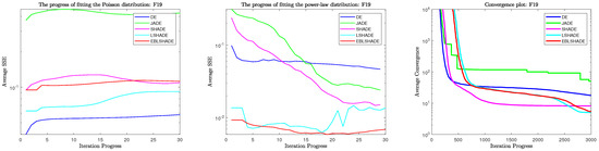 In Table 5, the results in problem 19 are quite different from those in problem 9; firstly, in the degree of fitting of the Poisson distribution, it is obvious that all the algorithms have approximate fitting results of the Poisson distribution except DE, which is the closest, and JADE, which is the furthest away. What is special is that SHADE has a crossover with EBLSHADE’s Poisson distribution fitting results in the late convergence period. Again, compared with the algorithm’s exploration ability, the JADE solution has the worst quality and has a clear step-down convergence process, which is more typical of the weaker exploration ability than other algorithms. The three algorithms with close exploration ability, SHADE, LSHADE, and EBLSHADE, are very close in terms of solution quality, and they all show a trend of continuous convergence in the convergence plots, which indicates that their exploration ability is also very close. In Figure 4, to comparing the fitting trend of the power-law distribution with the convergence graph, it is clear that SHADE has the most rapid approach to the power-law distribution regarding 20 statistics, and it is indeed the fastest converging algorithm before 2500 generations. Another favorable piece of evidence that the speed of approach to the power-law distribution is positively correlated with the speed of convergence is that there is a sudden and rapid approach to the power-law distribution in the late iteration of LSHADE, which is reflected in the convergence graph as the late and rapid convergence of LSHADE and which surpasses the convergence speed and the solution quality of EBLSHADE and SHADE at one go. Then, it stalls because it is no longer close to the power-law distribution. There is no doubt that the conclusion of question 19 can still support our hypothesis.
