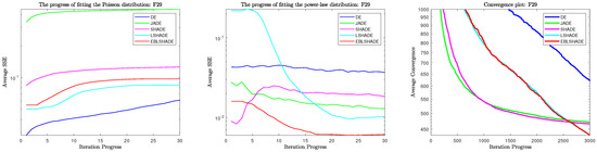 In Table 6, the results of problem 29 are again very different from the two previous problems, but this does not prevent us from being able to explain them with the same hypothesis. But this time we need to analyze the convergence plots before combining the fitting results and Figure 5. First of all, it can be seen from the fact that each algorithm does not stall on this problem, which does not require high exploration ability of the algorithm. Since the algorithm does not even fall into a local optimum, there is no need to jump out of it. Therefore, even if JADE still exhibits the weakest exploration ability, it can still obtain a good solution to this problem. Second, for the fitting results of the power-law distribution, the DE is hardly close to the power-law distribution, which is shown in the convergence plots as the slowest convergence rate and the worst quality of the solution. However, it should be noted that before the fifth statistic, the fast approach to the power-law distribution is only a small part of JADE and SHADE initially, with the arms JADE clearly approaching faster. LSHADE and EBLSHADE are slower, showing in the convergence plot that JADE has the fastest initial convergence rate and, together with SHADE, slows down quickly. At the middle of the iteration, roughly the 5th to 20th statistics, JADE and SHADE at this time are very slow in approaching the power-law distribution, while LSHADE and EBLSHADE are extremely fast in approaching the power-law distribution. The convergence plots at this stage show a continuous high rate of convergence of these two algorithms and surpass JADE and SHADE at the end.