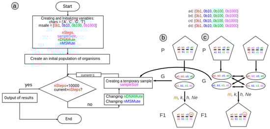 Figure 1. Figure 1. (a) Flow chart of the base model of population. (b,c) Dive details on the marker inheritance differences between asexual (b) and sexual reproduction (c). Ne—effective population size, m—mutation probability, k—number of offspring, h—probability of sexual reproduction.
