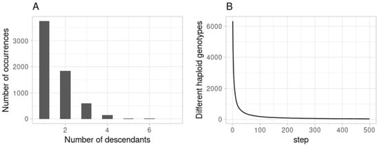 Figure 2. (A) Distribution of number of descendants in a fully asexual population of 104 organisms. (B) Diversity depletion in a fully asexual population of 104 organisms.