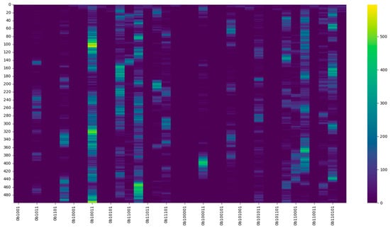A result of a simulation performed for a population of 10,000 organisms with a 0.33 probability to take part in a sexual reproduction for 500 steps is given in Figure 3. Each step is plotted as a horizontal array of bars, and the time flows along the vertical axis. The intensity of a bar is proportional to the number of copies of a given genotype, which is indicated on the horizontal axis following the binary notation as described above. It gives an idea about the changes of dominating genotypes and the succession of the dominants. It can be seen that at each generation, all the base characteristics of the population as well as a number of other metrics may be estimated. This base model may be modified by changing it according to the assumed scenario and/or the by defining the changes in the sexual/asexual ratio, which models seasonal shifts that are typical to many organisms adapting to seasonal fluctuations, and may be used to examine if this causes significant changes in their genetic diversity.