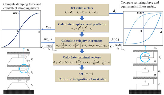 With the continuous development of viscous damping materials, viscoelastic materials, and metallic materials, more and more new types of dampers with greater energy dissipation capacity and deformation capacity have emerged [1,2,3]. The complexity of structural nonlinearities is heightened by the incorporation of diverse types of dampers [4,5]. The research significance of numerical integration methods has been reaffirmed in order to address the task of solving discrete motion equations. Time integration algorithms, often known as TIAs, are very popular in the field of structural dynamics owing to the simplicity with which they can be programmed [6,7].