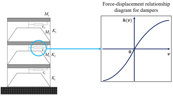 As shown in Figure 7, the current part makes use of a structural model consisting of three layers with nonlinear viscous dampers placed on each level. The exact parameters of the structural model are as follows: the mass of the 1st story is 8 × 105 kg, the mass of the 2nd and 3rd stories is 10 × 105 kg; the stiffness of the 1st, 2nd, and 3rd story is 3 × 106 N/m. Both the features of the seismic wave and the damping of the structure have been preserved in the same manner in which they were found before. In order to accurately characterize the viscous damper present on each level, the Kelvin–Voigt model is used. The corresponding calculation formula for this model is