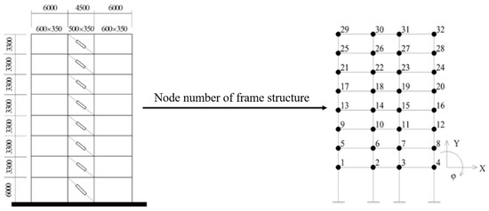 In order to conduct a thorough evaluation of the efficacy of the suggested approach in addressing seismic response in MDoF structures, a structural model with multiple degrees of freedom was developed based on the framework presented in a prior publication [49]. The structure in question is a concrete frame building consisting of eight stories and three spans. While Figure 9 is a depiction of the model’s schematic design. The specifics of the beams and columns that make up the structure are as follows: the columns are 600 × 600, the edge beams are 600 × 350, and the intermediate beams are 500 × 350. The structure under discussion comprises a total of 96 degrees of freedom, with each node showing two translational degrees of freedom in the x and y axes as well as one rotating degree of freedom. This gives each node a total of 96 degrees of freedom. On each level, a damper made of soft steel has been placed. In this investigation, the Bouc–Wen model is used in order to illustrate the relationship that exists between the dampers’ displacement and the force that they exert. The seismic wave that is being considered in this context is the same as the one that was considered above.
