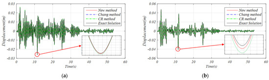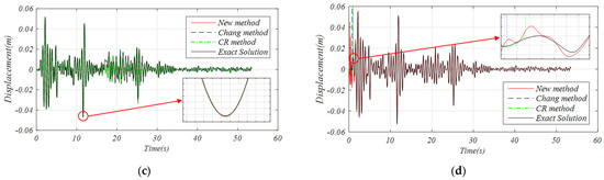The time step that is used in the calculation of the reference solution in the recommended technique, the Chang method, and the CR method is set to , while the time step that is used in the calculation of the reference solution in the original mean acceleration method is . The seismic response curves of the top displacement are shown in Figure 6. These seismic response curves were calculated using the recommended methodology, the Chang method, the CR method, and the corresponding reference solution, in that order. Table 2 displays the relative errors that were found between the reference solution and the maximum displacement phase.