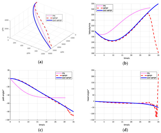 For the MPSP algorithm, the guessed control commands are needed. The traditional PN [30] is used to produce the initial values of in this paper, and the navigation ratio is settled as 6. In addition, a comparison with the MPSP guidance method presented in [21] is provided to validate the superiority of the method. The end condition for PN simulation is that the missile reaches the target. And the end conditions for the other two simulations are that the simulation times reach the desired impact time, which is 35 s on this occasion. For MPSP and CKF-MPSP methods, the tolerance value vector is settled as . The simulation results are shown below.