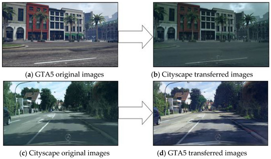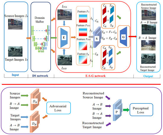 Feature domain adaptation methods [6,7] learn domain-invariant features by applying a feature-extraction model in a feature space [8] or a generative adversarial network model [9]. However, the training process of these methods is difficult to visualize, and there may be difficulties in capturing domain shifting at the pixel level and some edge information. In addition, pixel-level domain adaptation methods [10,11] utilize generative adversarial networks (GANs) [12] to adjust the source domain image in the original pixel space, making it resemble an image drawn from the target domain. Both feature- and pixel-level domain adaptation methods have advantages, and they operate in different ways [13]. As a result, some methods [14,15] combine feature domain adaptation with pixel-level domain adaptation to enhance the performance of domain adaptation from different aspects and achieve significant results.