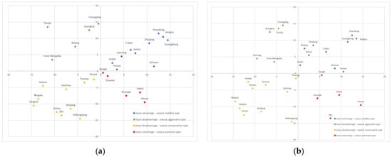 (a) Input–output efficiency positioning of the digital economy in China’s provinces under the digital infrastructure input. (b) Input–output efficiency positioning of the digital economy in China’s provinces under the digital technology input.