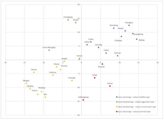 The three input variables and cross-efficiency values of the 30 provinces were sorted in the order of smallest to largest, and the median of the serial number is 15.5. Then, the difference between the ranking of the cross-efficiency values of each province was determined, and 15.5 was taken as the vertical axis coordinate of each province. The difference between the ranking of the three input variables of each province was also determined, and 15.5 was taken as the horizontal axis coordinate of each province. We drew a location scatter plot of each province so as to determine the classification positioning of the input–output efficiency of the digital economy in each province.