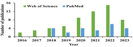Figure 1. Global trend of the publications containing the Keyword “industrial robot fault” in the title that were published per year, as determined by the Web of Science and PubMed.