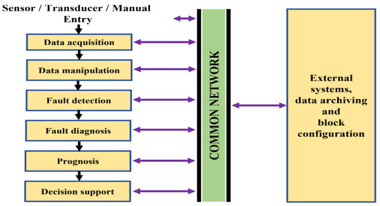 The technologies involved in robots have become complex and require a lot of feedback from the environment for efficient operation and precise control. The reliability of robots and their associated components is critical for minimum downtime and maximum production [18]. Robotic system health monitoring, diagnostics, prognostics, and maintenance have received a lot of attention as a result of the high-reliability requirements. The PHM of advanced robotics setup in industries are crucial for the smooth functioning of production and serviceable units. An efficient PHM approach for industrial robots and their rotating machines is the need of the hour [19]. A holistic framework for PHM [20,21,22,23,24] is shown in Figure 2. It comprises the data collection, data conditioning, fault detection (FDT), fault diagnosis (FDG), fault prognosis (FP), and decision support in a chronological manner [25,26,27,28]. The domains of fault detection, diagnosis, and prognosis have been extensively studied. The focus of this paper will be restricted to these topics.