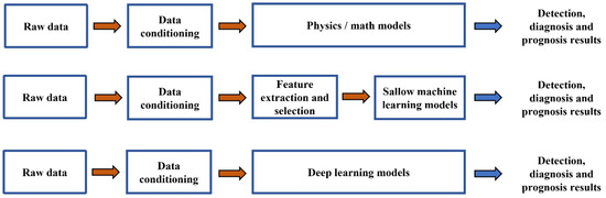 A model is created and simulated for the healthy and fault states in a typical model-based process. The assessment of the developed model under the system’s many functional modes is used to approximate the system’s remaining useful life (RUL). This is created by combining the time-averaged model probability and the weighted predictions from each mode. The reliability of many models is under scrutiny, and if it is unavailable, data-driven techniques are utilized to estimate the RUL. This is generally accomplished by visualizing the developing fault’s trajectory and the time it takes to obtain to the preset threshold value. The two famous fault prediction tools are the Kalman filter and the Alpha–Beta–Gamma tracking filter, which are often used in aerospace PHM and many other fields [43,44,45,46,47,92]. In hybrid approaches, both model-based techniques and data-driven methods are amalgamated and used for fault prognosis and diagnosis [93,94,95,96,97]. The traditional method of PHM is based on analytical models that draw on physical principles and subject-matter expertise. Systems with well-understood physics and well-defined failure mechanisms may respond well to this strategy. Analytical models for complex systems can be difficult and time-consuming to create, and they may not be correct in the presence of unexpected or unpredictable behavior. Machine learning algorithms that learn to recognize patterns in the data provide the foundation of the DL approach to PHM. This method can be used to analyze complicated systems with a wide range of failure modes as it is not constrained by the requirement to comprehend the underlying physics of the system. Deep learning algorithms are more resistant to unforeseen or unpredictable behavior because they may learn to adapt to changes in the system.