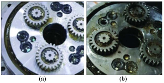 Figure 6. Faults in the industrial robots (a) Faulty reducer, and (b) Faulty Aged reducer [48].
