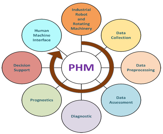 An efficient PHM strategy should detect incipient faults, diagnose faults, and estimate the RUL of the component or sub-elements. Both products and processes can benefit from PHM. The focus of product PHM is on a physical object. Monitoring a robot arm is an example of product PHM. In comparison to process PHM, product PHM is more readily available in the automobile, aerospace, and power generation industries [49,50,51,52,53,54,55,56].