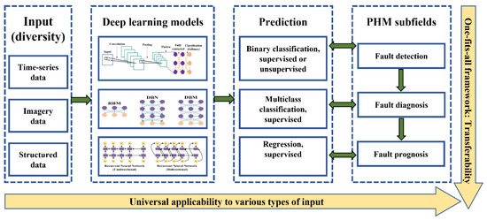 Figure 8. DL-based framework for the PHM including its subfield like fault detection, fault diagnosis, and fault prognosis for various types of input.