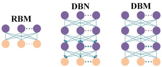 Figure 9. Structure of the RBM, DBN, and DBM (shaded boxes in lavender color represent hidden units).