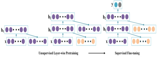 AEs are trainable in an unsupervised way. The stacked denoising AE (SDA) can offer an efficient pre-training solution. The model is trained by instantiating the weights of a DNN. When the SDA has been trained layer-by-layer, the auto-encoders’ parameters can be used to initialize all of the DNN’s layers. Then, on the labelled training data, supervised fine-tuning is used to reduce the prediction error. To map the output of the final layers to the targets, a SoftMax layer is typically placed on top of the AE-based structure; Figure 10 illustrates this step. The pretraining method using SDA improves the convergence speed of the DNN models compared to the random weight initialization. Training of the DNN includes issues like vanishing/exploding gradient problems. This is due to the commonly used nonlinear activation functions (tanh or sigmoid). As a result, auto-encoder-provided unsupervised training is valuable and effective.