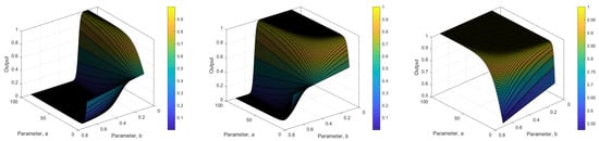Input and output relations with a and b variations in sigmoid function, when , , and (from left to right).