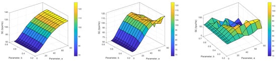 SE performances based on a and b variations in sigmoid function. SE (bps/Hz) versus a and b when dB, dB, and dB (from left to right).