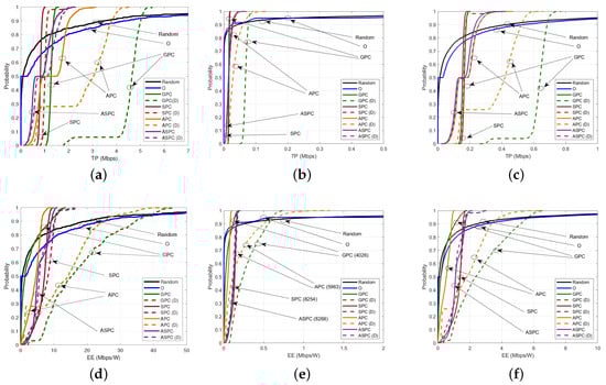 Performances of dropping technique based on cumulative distribution function (CDF). (a) Probability versus TP (throughput) (Mbps) when and ms. (b) Probability versus TP (Mbps) when and ms. (c) Probability versus TP (Mbps) when and ms. (d) Probability versus EE (Mbps/W) when and ms. (e) Probability versus EE (Mbps/W) when and ms. (f) Probability versus EE (Mbps/W) when and ms (from left to right).
