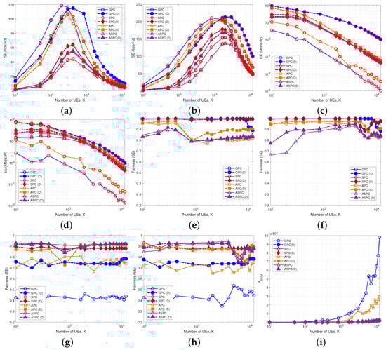 Figure 4i presents versus K when ms. As expected, GPC and APC require too much power as K increases, and the dropping technique can significantly reduce the . When ms, the situation is very similar to the case of ms.