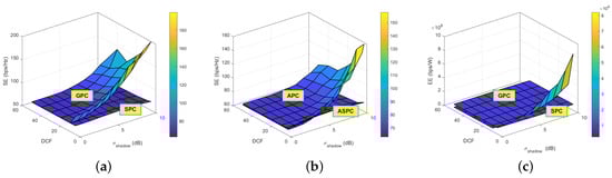 Figure 5 presents the 3D performances based on various parameters when and ms. Figure 5a,b show the SE versus DCF, and (dB). The performance difference between GPC/APC and SPC/ASPC is high when is high. Figure 5c,d show the EE versus DCF and (dB). Again, we can observe that the performance difference between GPC/APC and SPC/ASPC is high when is high. Figure 5e,f show the . For the careful choice of GPC and APC with the dropping technique, they can present better than SPC/ASPC. The case of also presents similar characteristics as shown in Figure 5g,h.