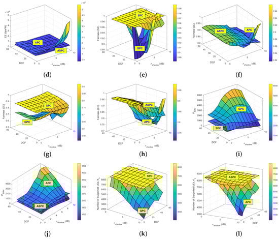 Generally, if DCF is large, GPC and APC consume more power (Figure 5i,j). This is because when DCF is large, GPC and APC support more UEs (Figure 5k,l). Compared with GPC/APC, for the cases of SPC/ASPC, the number of supported UEs does not change so much for the various values of and DCF.