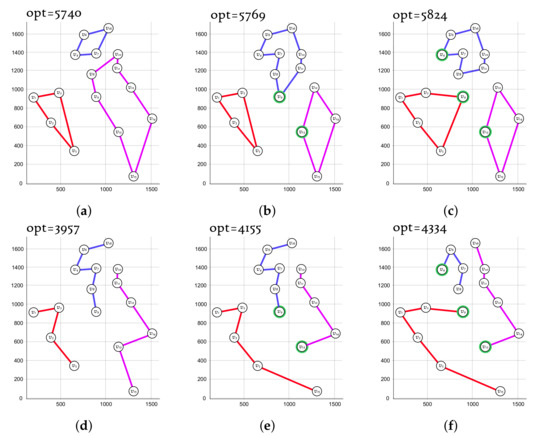 - Soylu, B. A general variable neighborhood search heuristic for multiple traveling salesmen problem. Comput. Ind. Eng. 2015, 90, 390–401. [Google Scholar] [CrossRef]
