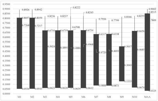 Table 6 and Figure 4 provide a comparison of the performances of the different algorithms on different network datasets. Figure 4 is the candlestick of the AUC results for CHLPA considering the average, the maximum, the minimum, and the standard deviation of the AUC values. The results presented in Table 6 and Figure 4 show that the performance of MAA outperforms any individual SIHI, indicating that the proposed method of generating a combined SIHI using GBDT is effective and that CHLPA significantly improves the algorithm’s performance. In other words, when constructing social influencers for integrated marketing in social networks, CHLPA accurately predicts the likelihood that overlapping node target users will establish friendships with other node users in the community. Table 7 provides a performance comparison between the traditional SLPA and MAA0 on Google Plus datasets, a combination algorithm constructed based on the traditional SLPA, and the proposed combined index architecture in this study. From Figure 4 and Table 7, it can be seen that MAA0’s performance is significantly better than that of SLPA, indicating that the proposed architecture for constructing combined indexes, which combines five network characteristics, GBDT, and three types of suitability indexes, effectively improves the accuracy of link prediction for overlapping nodes. Additionally, the performance of MAA is significantly better than that of MAA0, indicating that using global variables such as closeness centrality to characterize the network position of nodes, proposing SIHI based on the three-degree influence principle, and generating suitable combined indexes through GBDT accurately and effectively characterize the implicit social information in overlapping networks and improve algorithm performance.