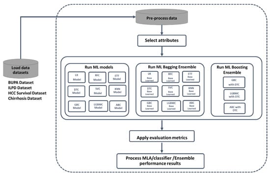 In order to evaluate the main risk factors of liver disease on clinical datasets, we employed a six-staged methodology as outlined in Guarneros-Nolasco et al. [54]. To enhance our analysis, we incorporated ensemble techniques such as bagging and boosting (as depicted in Figure 1) into this process. The Python programming language [55] and the Scikit–Learn [56] library algorithms were used. The stages involved were: (1) loading data dataset; (2) pre-processing data; (3) selecting attributes; (4) running ML models with bagging and boosting ensembles; (5) applying evaluation metrics; and finally; (6) processing MLA/classifier/ensemble performance results.