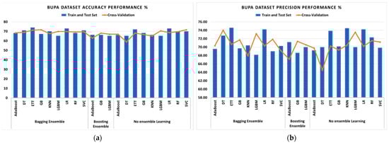 As can be observed from Table 6, with non-ensemble learning, we calculated algorithm performance using default values. With train and test split, LR exhibited the best results in terms of accuracy (73.08%). When using cross-validation, SVC exhibited the highest accuracy (71.60%). Conversely, the lowest-performing classifiers with respect to accuracy included DT and LGBM (65.38%) in train and test split and DT (58.87%) in cross-validation. Regarding precision, KNN proved to be the best-performing classifier in train and test split, while LGBM in cross-validation, with precision scores of 74.51% and 73.53%, respectively. The lowest-performing classifiers in terms of precision were AdaBoost (69.23%) with train and test split and DT (64.53%) with cross-validation. In conclusion, on the BUPA dataset with train and test split, LR exhibited good performance in terms of accuracy, f1-score, and roc_auc, whereas KNN outperformed in precision, and SVC outperformed in terms of recall. As for cross-validation, SVC exhibited the best results in accuracy, recall, f1-score, and roc_auc, whereas LGBM exhibited the best performance in precision.