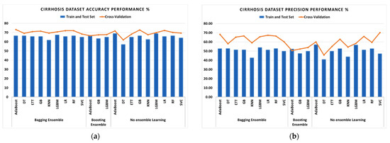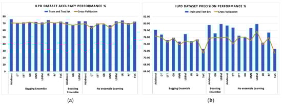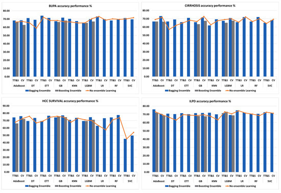 This research aims to identify the top four attributes or risk factors for the detection and prevention of liver disease by finding the best precision and accuracy results from the nine ML classifiers in different ensembles. We compared the results obtained from all the non-ensemble and ensemble (bagging and boosting) analyses and found out that the nine ML classifiers performed adequately on all the datasets with the two performance analysis strategies: train and test split and cross-validation (see Figure 7). Similarly, we noted that the bagging ensemble improved the accuracy of ET and AdaBoost on the BUPA and ILPD datasets with train and test split. However, in three of the four datasets (BUPA, CPD, and HCC Survival Dataset), the algorithms performed much better with cross-validation.